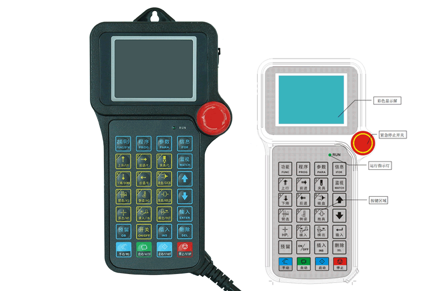 单轴注塑机械手系统应用为DB真·人(科技)系列注塑机械手控制系统HC-S1,手控器操作面板如下图: